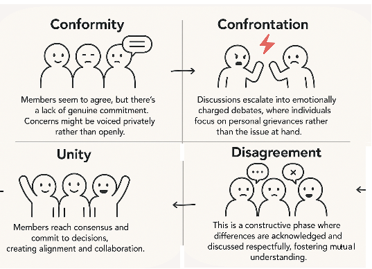 الخلاف : هذه مرحلة بناءة حيث تُعترف بالاختلافات وتُناقش باحترام، مما يعزز التفاهم المتبادل. تسمح هذه الحالة بالنقاش الصحي واستكشاف وجهات النظر المتنوعة، مما يساهم في اتخاذ قرارات أفضل وبيئة أكثر شمولًا